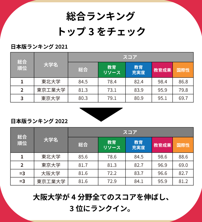 大阪大学从去年的第 5 直接冲进前 3,和东京工业大学并列第 3。
