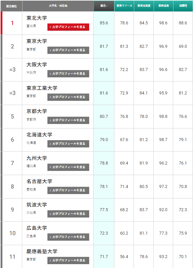 东京大学今年成功挤掉东京工业大学,重回第 2 的宝座;