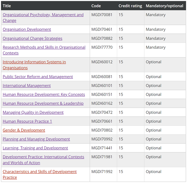 在4门必修专业课中,有一节是专业学习辅助课程,即《学术写作与研究方法》,主要教学生如何开展研究,怎么写论文;另外三门都是专业课,分别是《组织心理学》、《组织发展》和《组织变革》。这几门课和我之前的工作和未来规划非常匹配,其中包含了组织诊断、组织发展干预、组织行为、变革管理等相关内容,感兴趣的朋友可以在招聘网站上搜下HRBP或者OD、TD岗位的招聘要求就可以感受到。