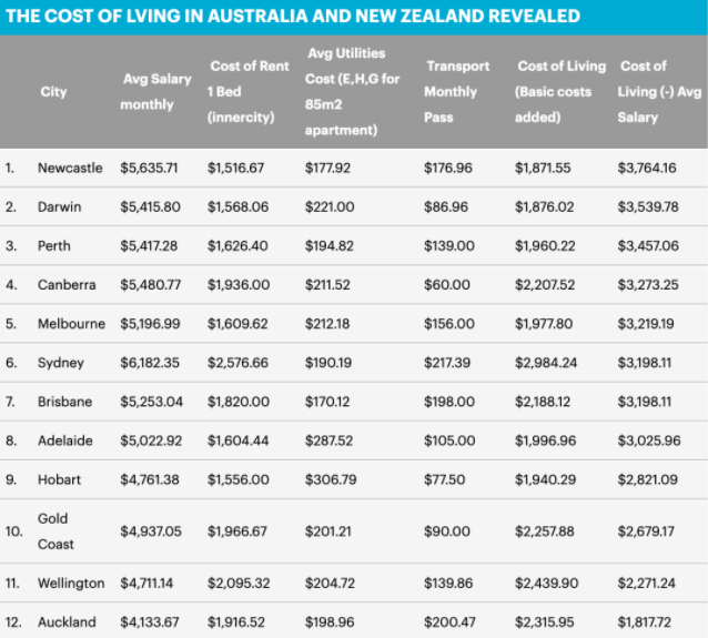 通过计算平均工资和主要支出——房租、交通费和公用事业费的差额,这份榜单大体反映出不同城市的生活压力(目前 1 澳元约为人民币 4.7 元):