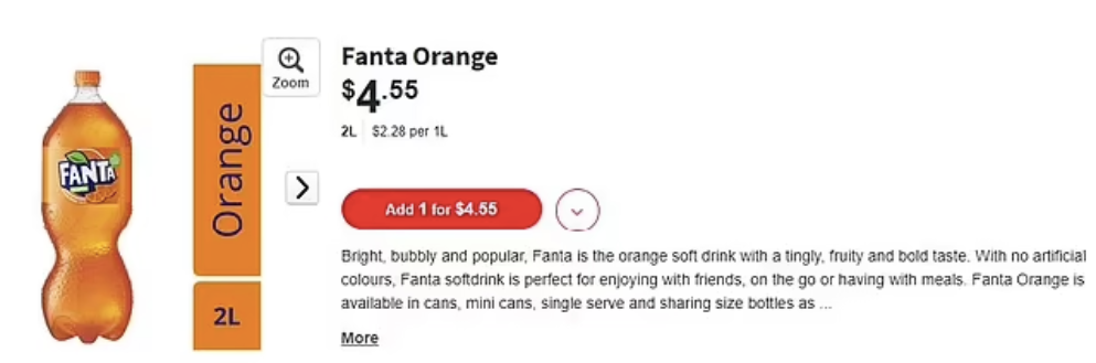 最夸张的是橙色芬达,2021 年 2 月在 Coles 超市的价格是 2.35 澳元(约人民币 11 元),时隔一年竟然卖出了 4.55 澳元(约人民币 21.5 元)的高价,价格上涨了 94%,几乎就是翻了一番,令人难以置信!