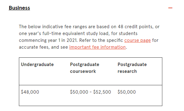 举个例子吧,早在去年,悉尼大学就直接将商科研究生最高学费涨到了 50,000 澳元(约人民币 236,900 元),成为所有澳洲大学中唯一一个学费突破 5 万大关的学校。