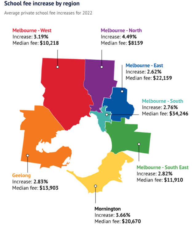 再来看私立学校,维州私立学校的学费今年将平均上涨 2.9%。维州家长支付的私立学校学费平均数是全澳最高的,为 14,140 澳元(约人民币 66,700 元)。在墨尔本内东南郊区的私立学校区,平均学费高达 34,246 澳元(约人民币 162,000 元)。