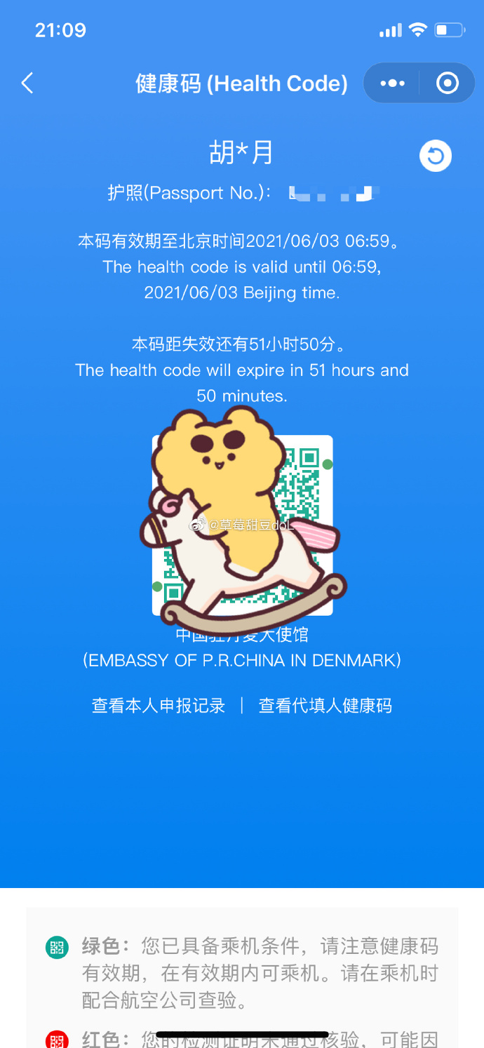 2020年10月,疫情好转,在打了疫苗后又她再次返回英国。今年5月,经历了两次机票被取消的坎坷,草莓同学最终买到了5月31日伦敦-哥本哈根-北京这条航线的机票,顺利回国。