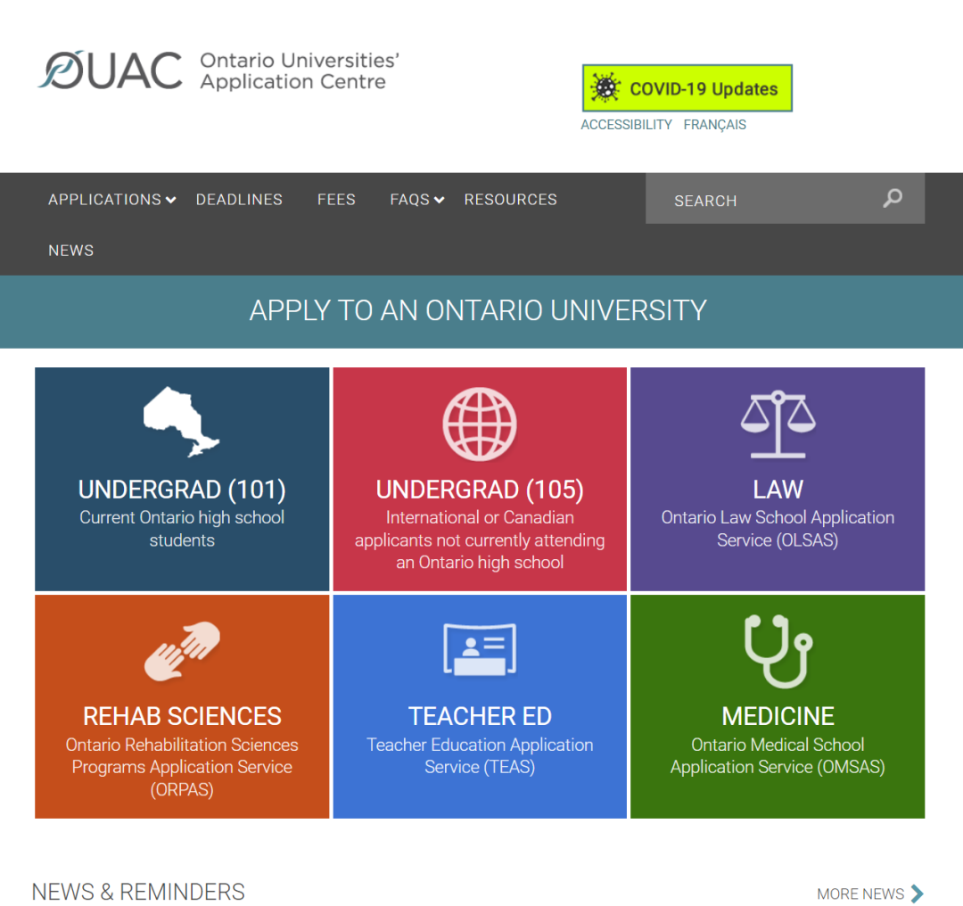 安大略省的大学本科申请网站叫做OUAC,全称为Ontario Universities' Application Centre,安省所有大学都在这个网站里,不管你是来自哪里的高中生,都需要通过这个网站来申请。