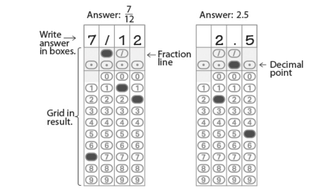 值得一提的是:填空题(Grid-In Questions)需要考生计算后将答案写在专用的答题框内。每个答题框由四个方格组成,且每个方格下对应有机读的圆圈,分别表示数字 0-9 及分号(/)、小数点(.),考生必须根据所得答案涂黑下面对应的圆圈。