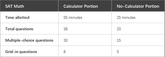 数学部分又分为可使用计算器和不可使用计算器两部分,主要考查代数、问题解决和数据分析、高等数学入门、几何、三角等相关内容。其中: