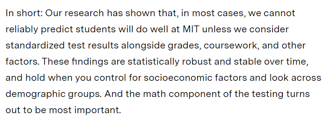 MIT 招生办主任在解释学校决定恢复标化考试成绩要求时表示:“MIT 的研究表明,在大多数情况下,必须把标化考试成绩与平时成绩、作业和其它因素一起考虑,否则无法可靠地预测学生是否能够在 MIT 取得好成绩。”