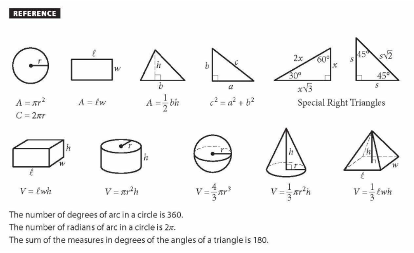 整体来说,SAT 的数学对于接受过中国传统数学教育的学生来说还是比较简单的,但对于基础阅读能力欠缺的考生可能有所挑战。对于数学几何相关的公式和定律,SAT 一般会直接给出(如下图)。