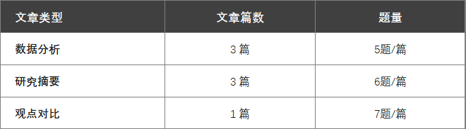 数据分析:这类文章难度较低,文章特点是图表搭配较少的文字描述,重点考查同学们对图表的解读,偶尔会涉及一些科学常识性问题。