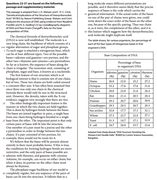 阅读部分共有 5 篇文章,每篇文章的字数在 500-750 字之间。文章通常节选自世界经典小说、历史及社会学相关文章、美国建国文献或者当代重大全球话题演讲,以及自然科学相关文章。从题目形式上看,跟大部分英语考试中的阅读理解没有区别。