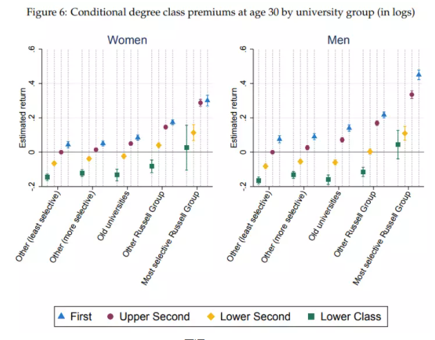 从最英国最顶尖的高校,比如牛津、剑桥、伦敦帝国理工学院和伦敦经济学院获得 学位的学生在 30 岁时的平均收入比仅获得 2:2 学位的学生高 20%。而从知排名较低的几所院校,获得 2:2 学位和获得 2:1 学位的学生收入差距,女生为 6%,男生则为 8%。