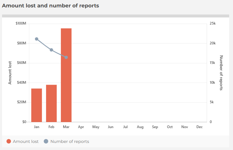 除了租房骗局,各种诈骗在澳洲一直呈高发态势。根据 ACCC 的 Scamwatch 统计的最新数据,澳洲今年 3 月各种类型的诈骗金额高达 9500 万美元,这是 Scamwatch 记录的最大月度损失。与 2 月份相比,3 月份因诈骗损失的金额增加了 150% 以上,也比去年同期报告的 2000 万美元大幅增加了近 400%。