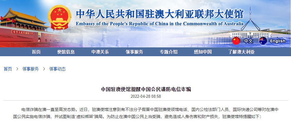 大使馆表示:近日注意到有不法分子假冒中国驻澳使领馆电话、国内公检法部门人员、国际快递公司等对在澳中国公民实施电信诈骗,并试图制造“虚拟绑架”骗局。因此,提醒在澳中国公民谨防上当受骗,避免造成人身伤害和财产损失!