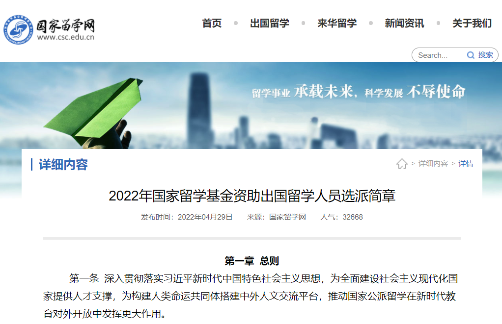 1.了解选派计划《2022年国家留学基金资助出国留学人员选派简章》、选派类别、基本申报条件和申请时间等相关信息(国家公派出国留学外语合格条件:https://www.csc.edu.cn/article/1937);