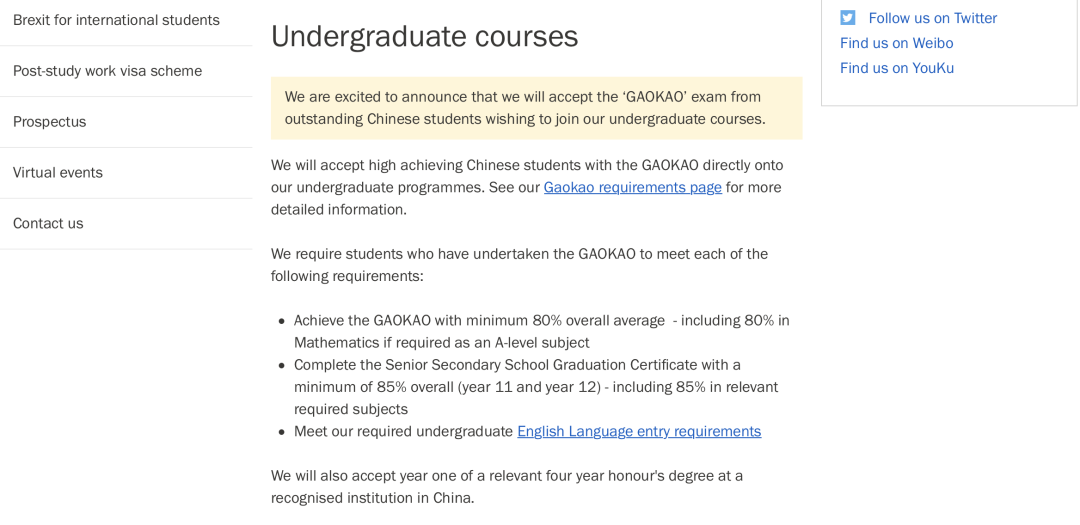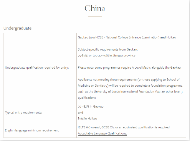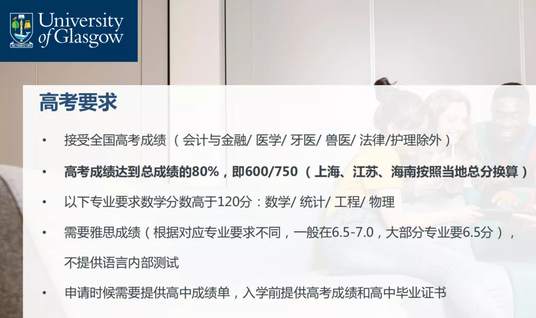 每所英国大学对于高考成绩的要求及其附加条件,比如高中三年平均分,英语成绩等,要求均有区别。大家在准备申请时可以先进入学校官网查询具体信息。