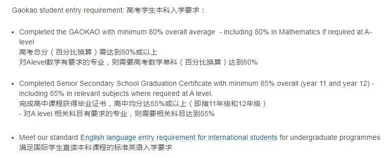 ● 对A-level数学有要求的专业,则需要高考数学单科(百分比换算)达到80%。此外,学生需完成高中课程获得毕业证书,高中均分达85%或以上(即指11年级和12年级)。