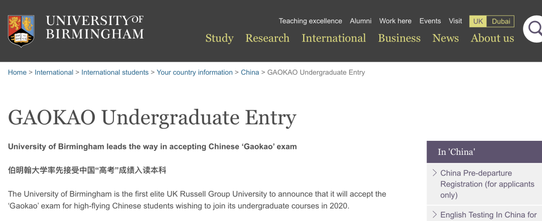 伯明翰大学是英国罗素集团大学中第一个宣布,从2019年开始接受参加中国高考并有志向入读伯明翰大学本科学习的学生。