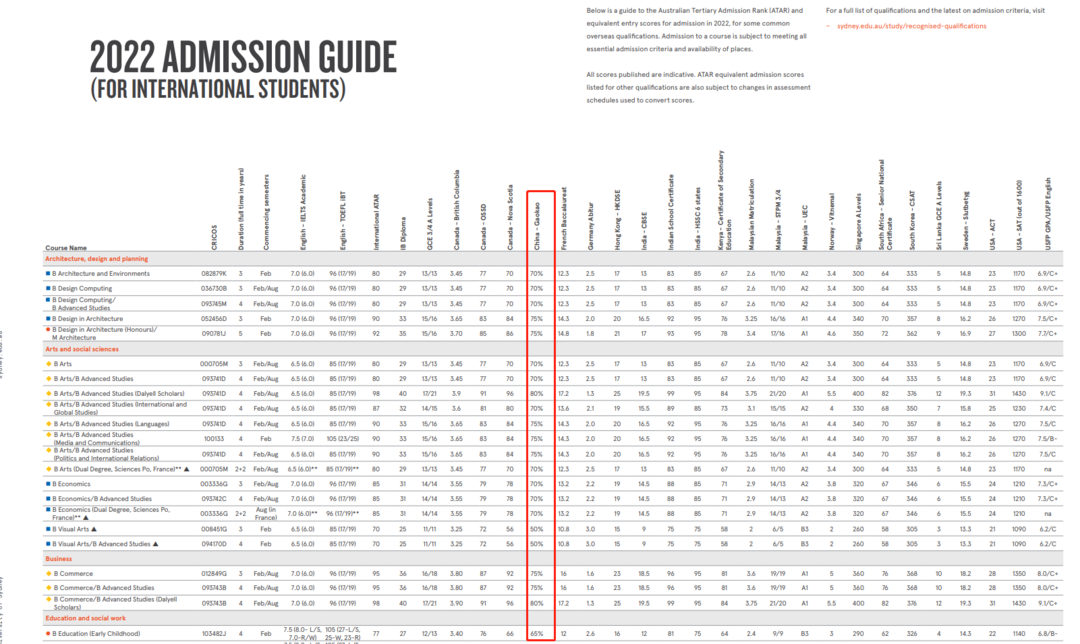 高考成绩要求达到各省高考总分的70%-90%,商科要求在70%-86%不等;工程要求在75%-80%不等。