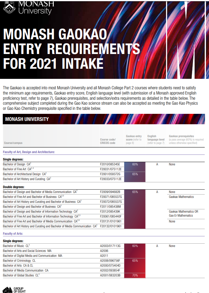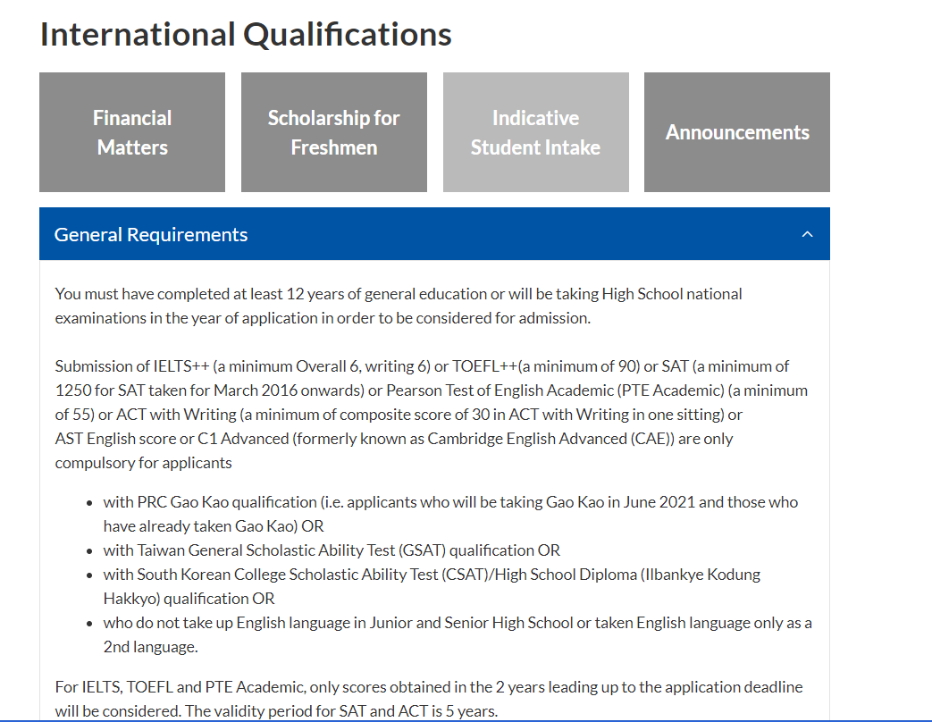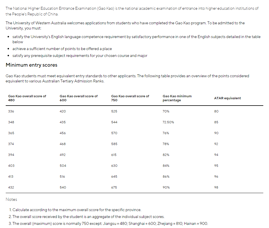 ● 本科Typical entry requirements要求高考成绩达到75-82%,外加会考成绩85%。