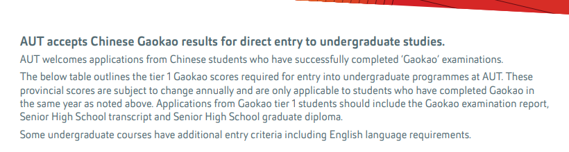 奥克兰大学接受中国学生以高考成绩申请入学,将根据各地区的本科分数线决定录取线。