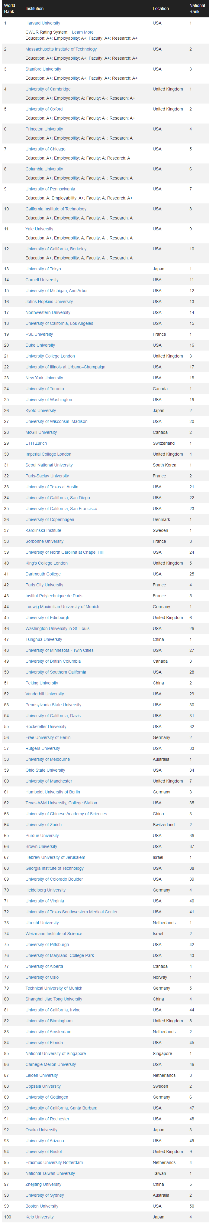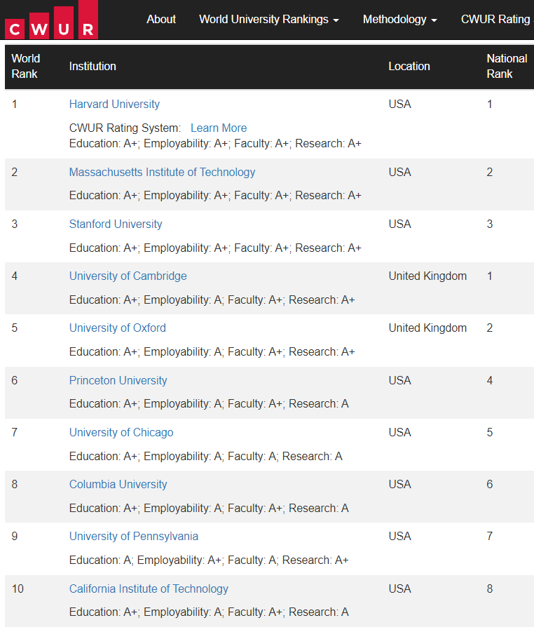 CWUR TOP10 榜单