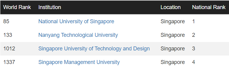 本次,新加坡共有 4 所院校进入 CWUR 排名。其中,新加坡国立大学位列世界第 85,较去年排名上涨了 4 位;南洋理工大学依然为新加坡第二。