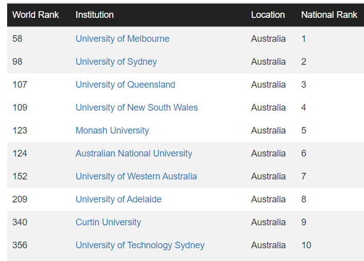 在澳洲大学排名中,澳洲八大(澳洲国立大学、墨尔本大学、悉尼大学、新南威尔士大学、昆士兰大学、蒙纳士大学、西澳大学、阿德莱德大学)全部进入澳洲前十榜单。