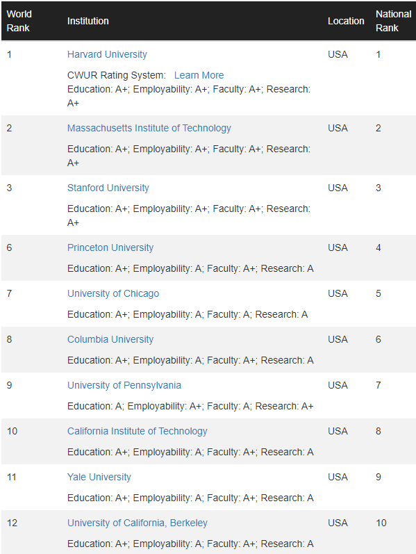 前三均来自美国,分别是哈佛大学、麻省理工学院和斯坦福大学。其中,哈佛大学连续第 11 年摘得桂冠,要知道,CWUR 排名首次发布是在 2012 年,你们算算~