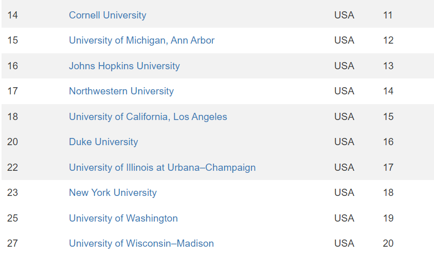 美国国内排名 11~20 的院校分别是:康奈尔大学、密歇根大学安娜堡分校、约翰霍普金斯大学、西北大学、加州大学洛杉矶分校、杜克大学、伊利诺伊大学厄巴纳-香槟分校、纽约大学、华盛顿大学、威斯康星大学麦迪逊分校。