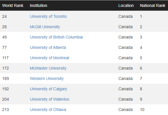 加拿大 TOP10 的院校和去年保持一致,其中有 4 所院校进入世界百强榜: