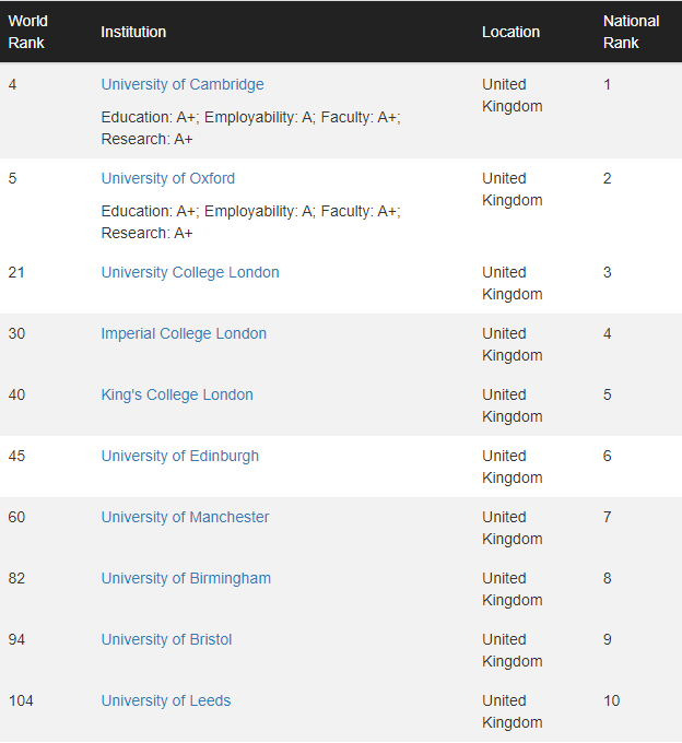 英国 TOP10 院校和去年一致,其中有 9 所院校入围世界 TOP100,分别是:剑桥大学(第 4)、牛津大学(第 5)、伦敦大学学院(第 21,较去年下降 2 名)、帝国理工学院(第 30)、伦敦国王学院(第 40,较去年上升 3 名)、爱丁堡大学(第 45)、曼彻斯特大学(第 60,较去年下滑 3 名)、伯明翰大学(第 82,较去年下滑 3 名)、布里斯托大学(第 94,较去年下滑 3 名)。