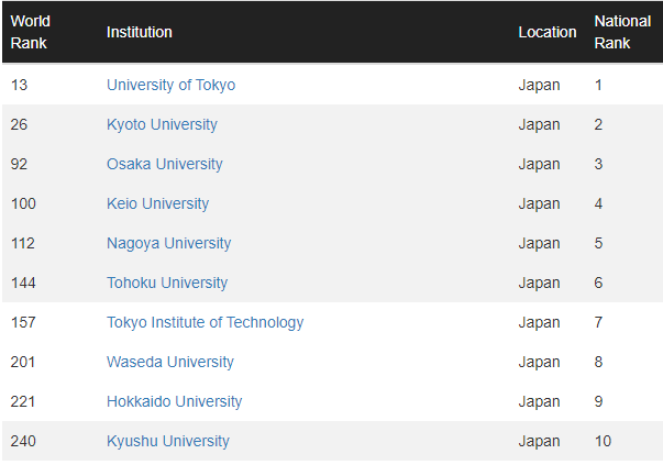 日本今年有 4 所院校进入 TOP100,分别是:东京大学、京都大学、大阪大学、庆应大学。值得一提的是,东京大学不仅是日本第一,更是蝉联了亚洲第一的宝座。