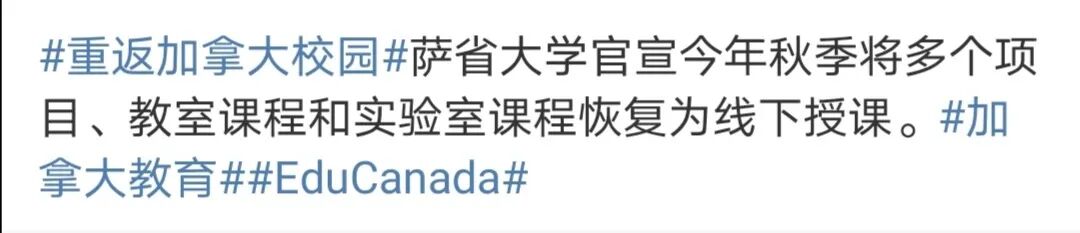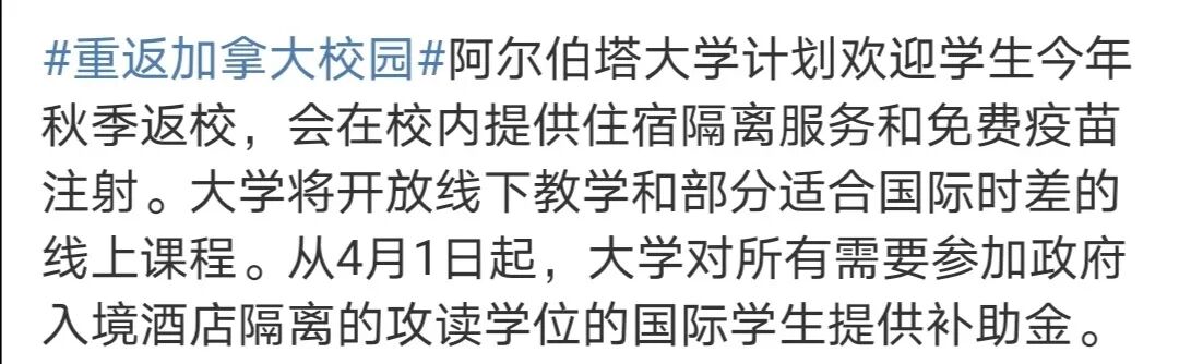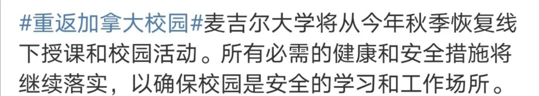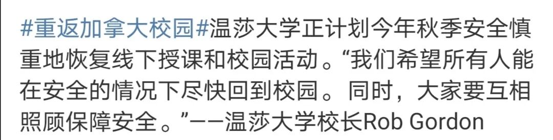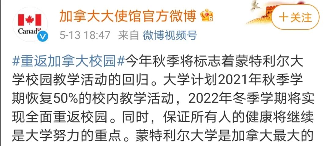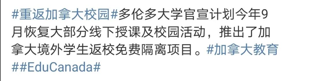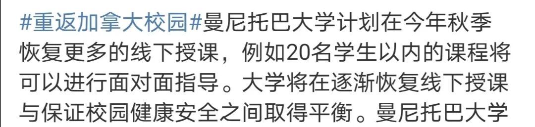根据加拿大大使馆微博发布的消息,目前已有多所加拿大高校宣布了秋季学期计划,包括渥太华大学、多伦多大学、阿卡迪亚大学、曼尼托巴大学、温莎大学、麦吉尔大学、蒙特利尔大学、阿尔伯塔大学、萨省大学。大部分学校都计划在确保安全的情况下,于秋季学期增加更多的线下授课课程和校园内活动,为学生提供全面丰富的校园体验。