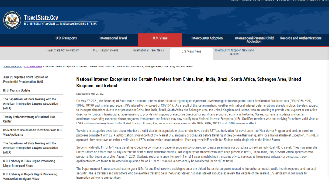 5月27日,美国宣布目前持有效F-1/M-1签证的留学生,如就读院校定于2021年8月1日之后开学,可在开学前30日内持有效签证直接入境美国。同时,满足以上条件的留学生可直飞入境美国,无须进入第三国中转。