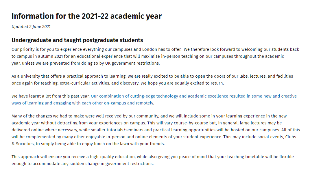 目前,很多英国大学都公布了新学期的返校时间安排和授课模式,不过因疫情和政府政策一直处于动态变化中,未来还会出现调整的情况。