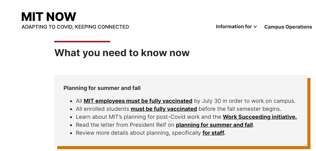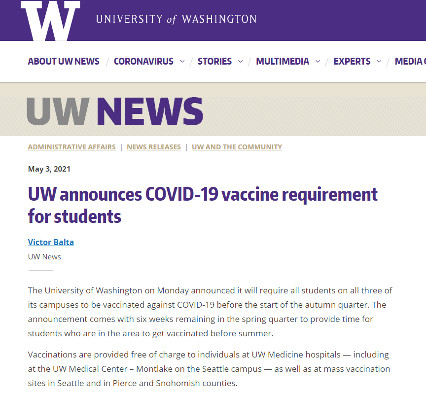 根据各学校官网消息,目前已经有约240所美国大学对秋季学期做出了强制疫苗接种的规定。包括哈佛大学、麻省理工学院、华盛顿大学、东北大学、波士顿大学、马塞诸塞州立大学系统中的所有学校等。