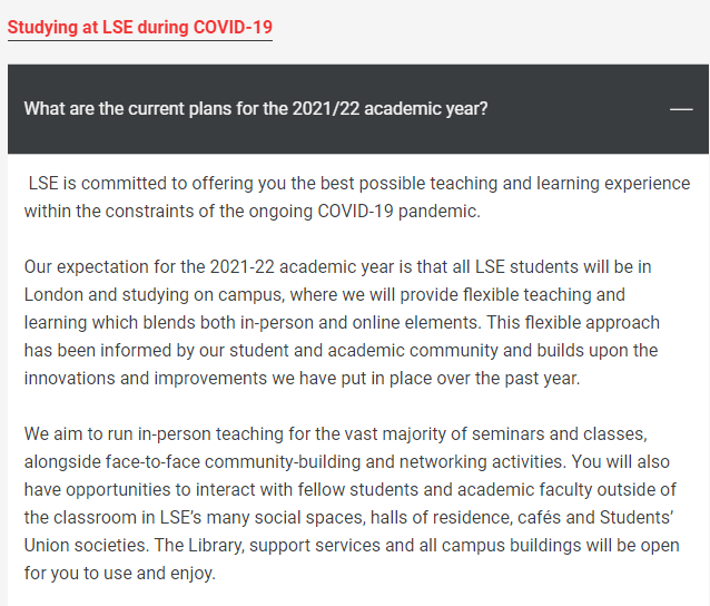 伦敦政治经济学院表示,学校希望在2021-2022学年, 所有学生都能在伦敦的校园内学习,并将提供融合线下和线上的灵活教学模式。