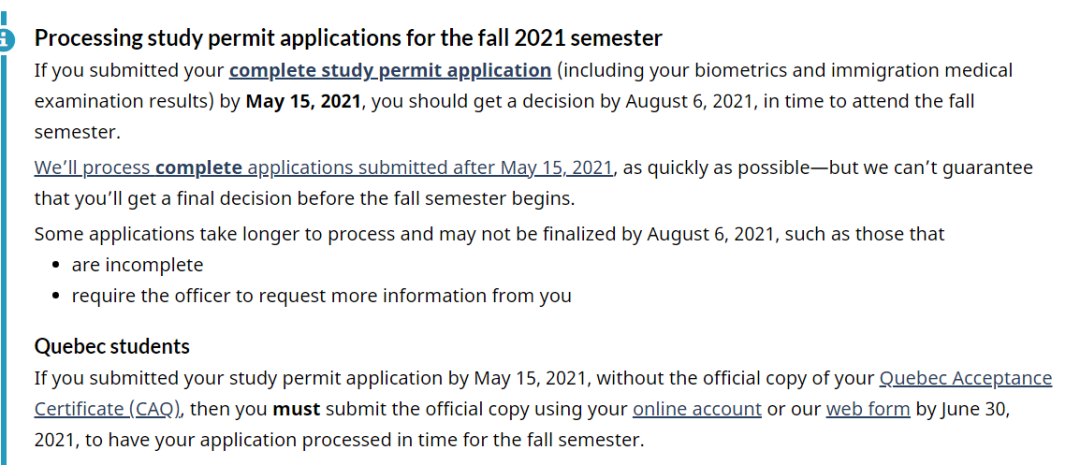 对于计划在2021年秋季入学的留学生们,加拿大移民局也给出了具体的时间安排,如果学生在5月15日前完成了学习许可申请,那么就将在8月6日前收到结果,以便能按时开始秋季学期的学习,对于5月15日之后的申请,移民局将尽快处理,但不能保证在秋季学期开始前提供申请结果。
