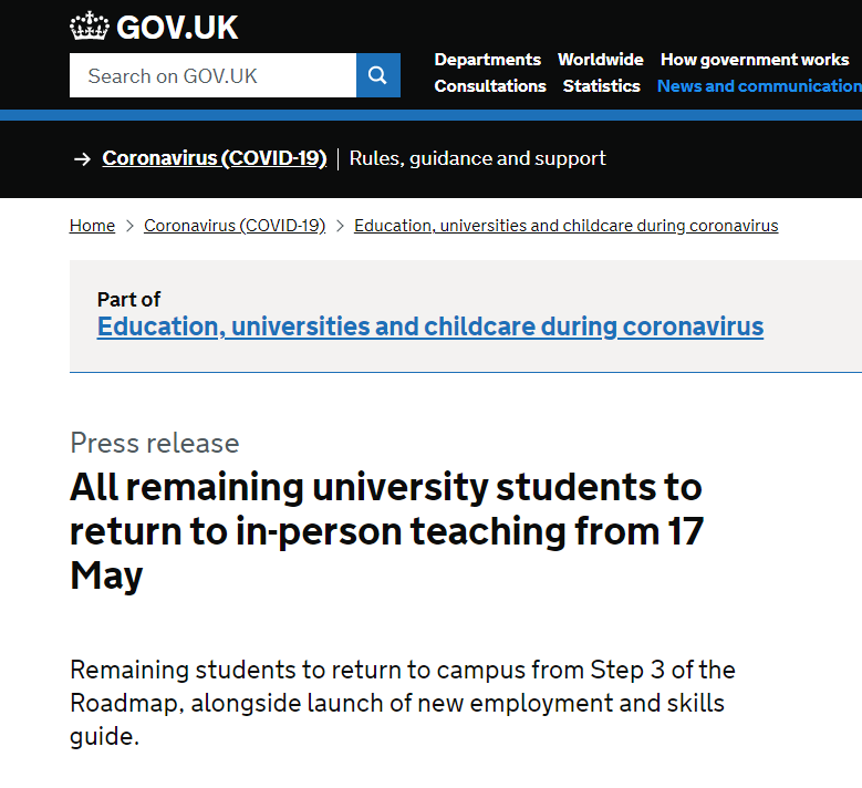 5月17日,英国政府官网发布消息,即日起,所有大学生,包括国际留学生在内,都可以重返校园,线下教育将全面恢复。不过,在秋季学期授课方面,各个大学都有不同的安排。