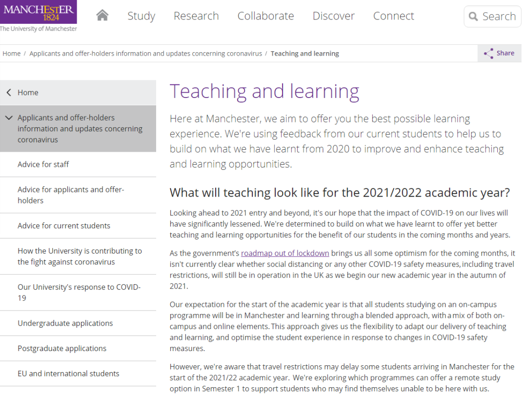 曼彻斯特大学表示,为最大程度地灵活应对英国政府针对新冠肺炎疫情可能采取的措施,校方期待新学年所有学生能够在校园内上课,并采取线上线下相结合的授课方式。在家上网课的形式不是统一默认的授课模式,为此不同院系会向各自学生书面确认具体授课方式,对确有困难不能来校上课的学生,也会通过线上课程确保学生的学习体验。