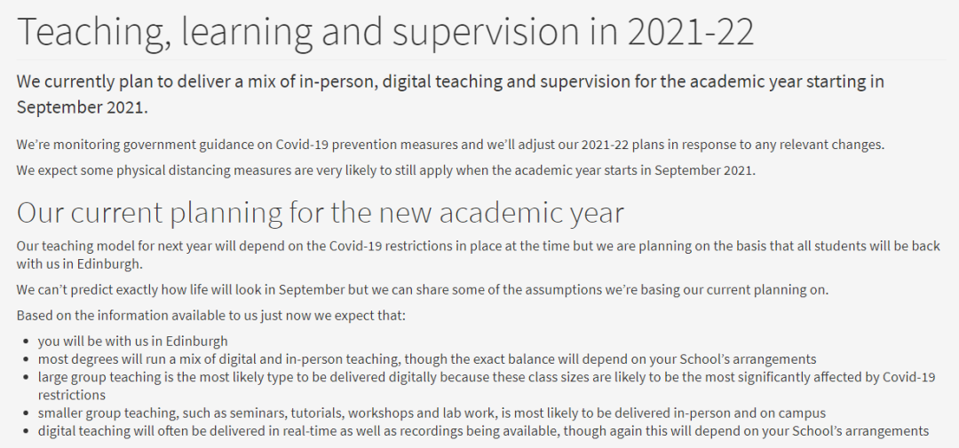 爱丁堡大学宣布,2021年秋季学期将于9月20日开始, 对人数较多的课程,大概率将采用线上教学的模式,而人数较少的课程,比如seminars, tutorials, workshops, lab work等将可能在学校线下开展。最终计划会根据疫情变化情况和国家政策进行适当的调整。