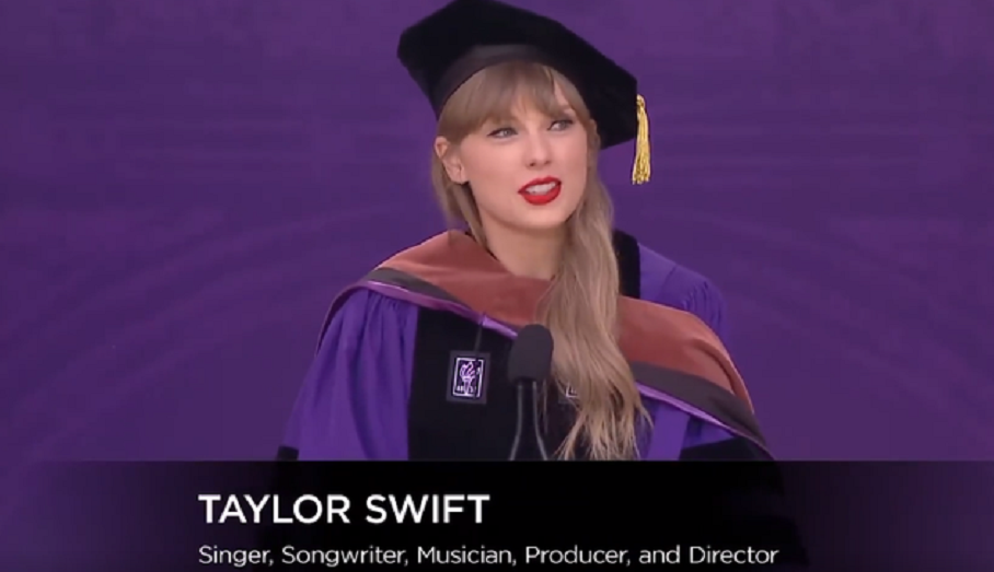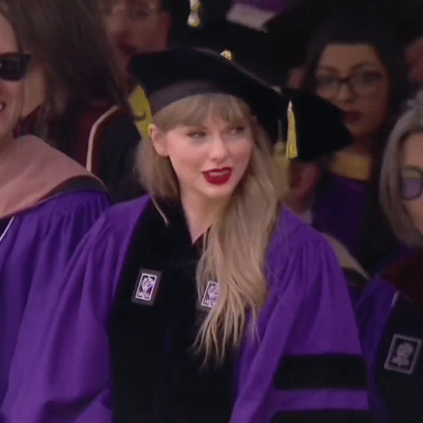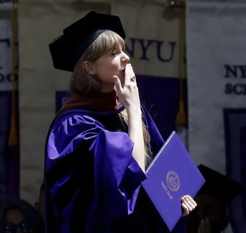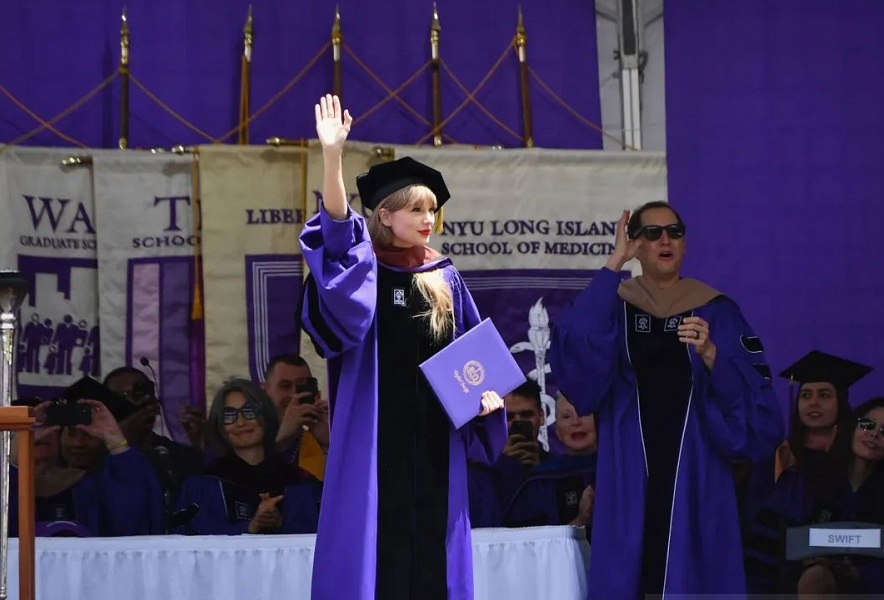 毕业典礼全程直播,镜头一扫到进场的 Taylor Swift,全场都沸腾为她欢呼,整个毕业典礼仿佛变成了她的专场演唱会。在万众瞩目之下,她发表了毕业致辞,感谢 NYU 让她圆了“大学梦”。
