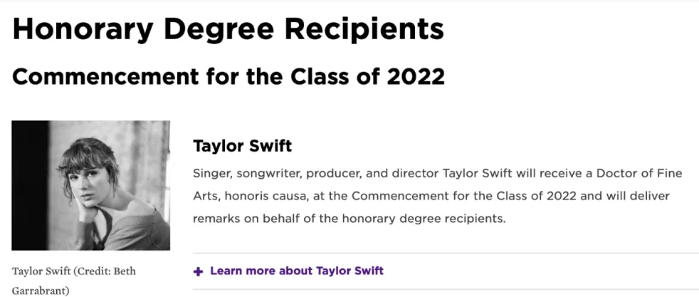 NYU这一届的毕业生,不仅赶上了后疫情期久违的现场毕业典礼,还碰上了超幸运的事儿:美国流行天后霉霉(Taylor Swift)和他们一起参加毕业典礼,并作为嘉宾发表演讲!