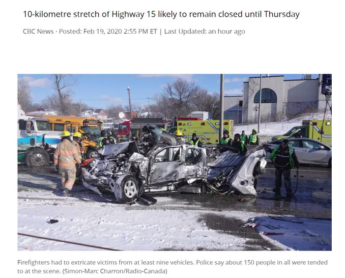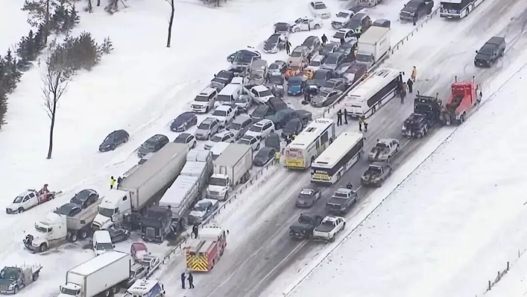去年2月,在蒙特利尔高速上,雪天高速突发狂风,200辆车刹车不及连环相撞。其中包括了油罐车、校车、和卡车,现场极其惨烈。