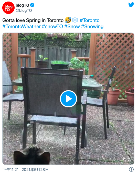 五六月的日子,国内已经开始过夏天了,然而多伦多竟然开始飘雪?!可能压箱底的Canada Goose又要翻出来披上了....