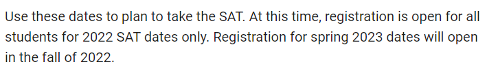 2)目前只能注册 2022 年下半年的 SAT 考试,2023 年上半年的 SAT 考试需要到秋季才能报名;