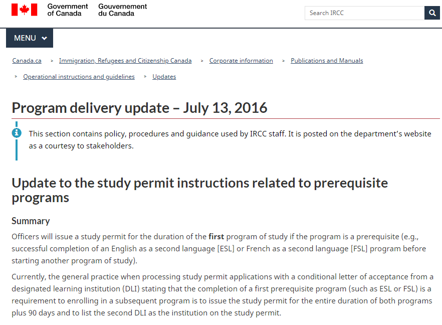 自2016年7月开始,加拿大移民局对双录取签证政策做出了调整,现行政策为:对于双录取的学习许可申请人,加拿大移民局将会先针对其语言课程签发学习许可(效期为语言课程的时长加上一年)。待学生语言能力达到进入大学院校正式学习专业课程的条件后,还要再申请新的学习许可。