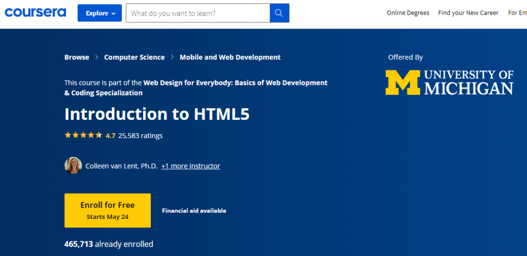 密歇根大学已通过 Coursera 向公众开放了“ H5 入门”课程。该免费课程可以作为独立课程学习,同时也是密歇根大学付费课程“人人都会网页设计”(Web Design for Everybody)课程的第一部分内容。