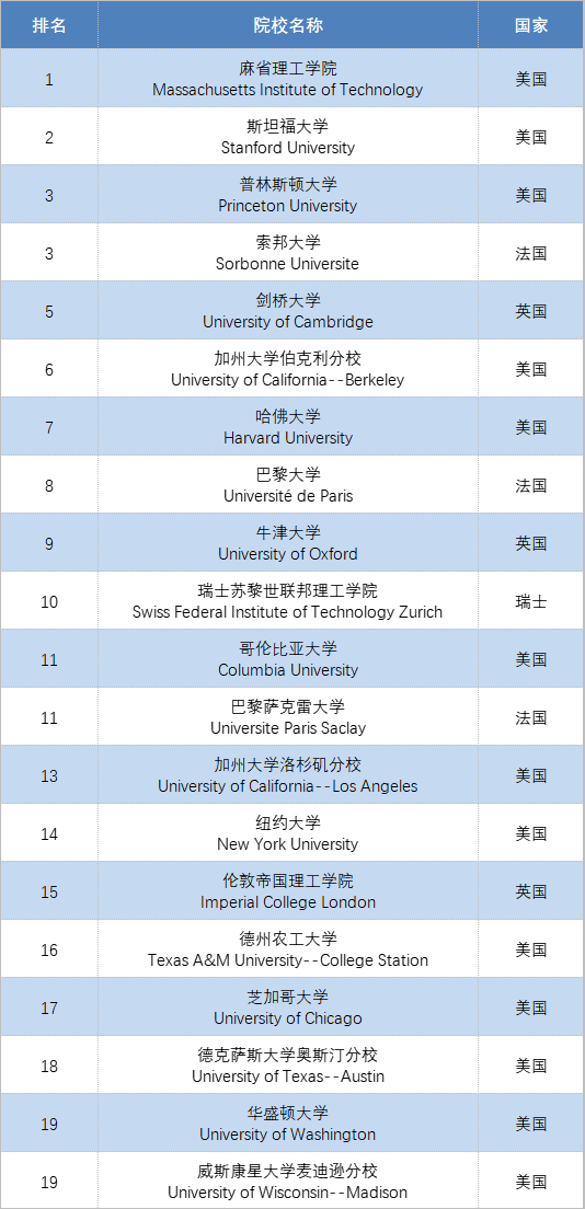 而在 TOP20 的院校中,美国院校占了半壁江山,共有 13 所院校上榜;而法国和英国,各有 3所院校进入 TOP20 榜单。